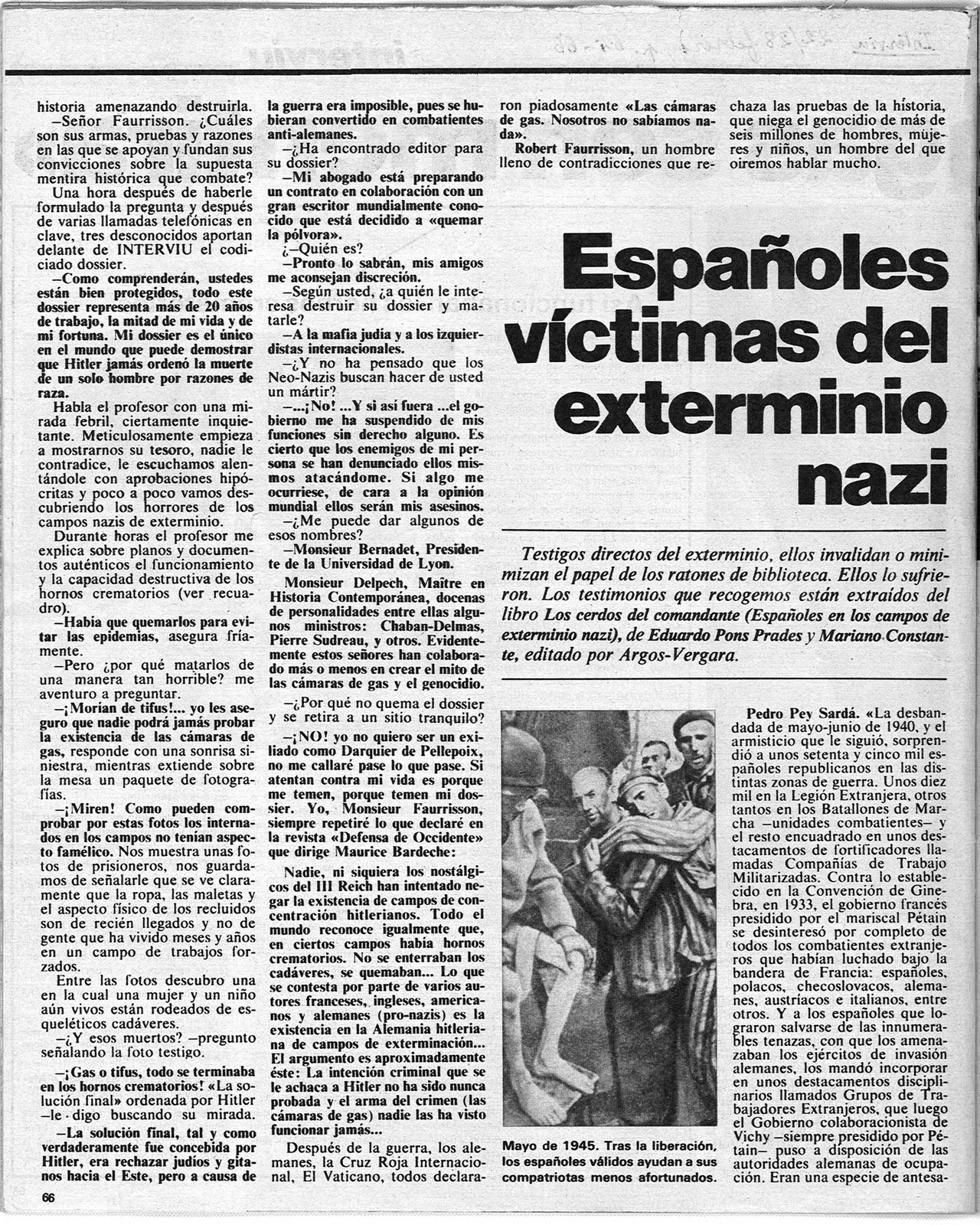 For years I tried to publish the plans in question. Impossible. One day a friend told me he knew a Spanish journalist who perhaps would agree to publish an interview with me, along with some photos. The newspaper was the Spanish magazine Interviu. The journalist was Vicente Ortuno and the photographer was Jean Marie Pulm. They came to Vichy. They promised me and my friend not to publish any photo of my face, and that an agreement would be signed before any publication. In fact they lied. They quickly published what you can see in Interviu (22-28 February 1979, p. 64-66; please see the reproductions below). In the article I am described as a sadistic Nazi. I have the French translation of that article but it is of no interest. I filed a lawsuit in Paris. I won my case but the amount of damages was ridiculous (the presiding judge was a Jewess by the name of Simone Rozès).