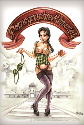 La caricature ci-dessus nous montre une prostituée en bas résille avec, à main droite, son soutien-gorge tout juste enlevé et, à main gauche, les pièces de monnaie qu’elle vient de récolter. Sur chacun de ses seins mis à nu se trouve dessinée une étoile juive. Elle sourit de contentement. En arrière-plan, se dessine le portail d’Auschwitz-Birkenau par lequel s’engouffraient les convois de déportés. La créature, elle, danse sur les rails. Elle est heureuse. Sa manière de servir la mémoire de la souffrance juive au temps d’Adolf Hitler est parfaitement obscène et lui permet de s’enrichir. Elle ne sert qu’une « Mémoire » réécrite d’une manière répugnante et à des fins sordides. Avec elle nous ne sommes plus dans la création historique ou historiographique mais dans l’invention pornographique. L’expression nouvelle de « pornographie mémorielle » convient à cette innovation de la propagande et de la publicité modernes qui, on le voit chaque jour, ne s’embarrassent d’aucun scrupule.